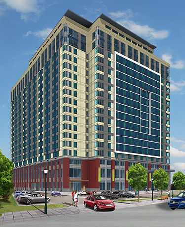 Omar and Christine Lee are developing the 418,000-square-foot building, which will have 370 market-rate apartments, a 189-room hotel, and more than 500 parking stalls in a garage and on the surface.