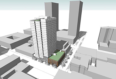 In the preferred option, Fourth & Bell Tower would have 287 residential units, 8,768 square feet of ground-floor retail space, and 204 parking spaces below grade.