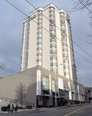The 16-story art deco structure is one of the tallest and most recognizable buildings in the U District. It is also just north across 45th from the light-rail station scheduled to open in 2021.
