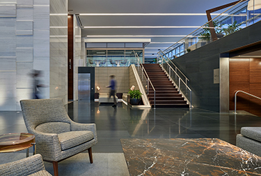 Here is the project team: GLY Construction, general contractor (main lobby, second floor enclosure and glass entry); Turner Construction, general contractor (levels four and five renovation, mechanical, exterior windows); Schuchart, general contractor (core restrooms, elevator lobbies, level 38 conference room, executive parking); Greyscale Design Studio, interior design: MKA, structural engineer; RDH Building Science, building envelope; WSP, MEP engineer; Blanca Lighting Design, lighting design; and Studio SC, graphics and wayfinding.