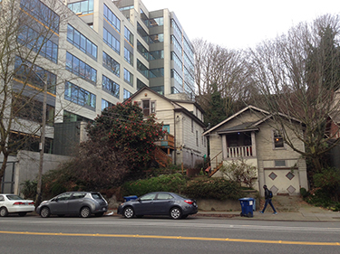 There's a group of four little wood-frame houses along Dexter Avenue in the canyon of new buildings west of Lake Union, but they are about to disappear.