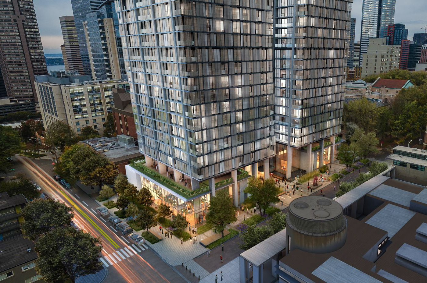 Westbank is proposing two 33-story towers with 488 units above a three-story podium. Underground parking for 316 vehicles on six levels will be accessed from the alley to the west. About 6,000 square feet of retail and restaurant space is planned.