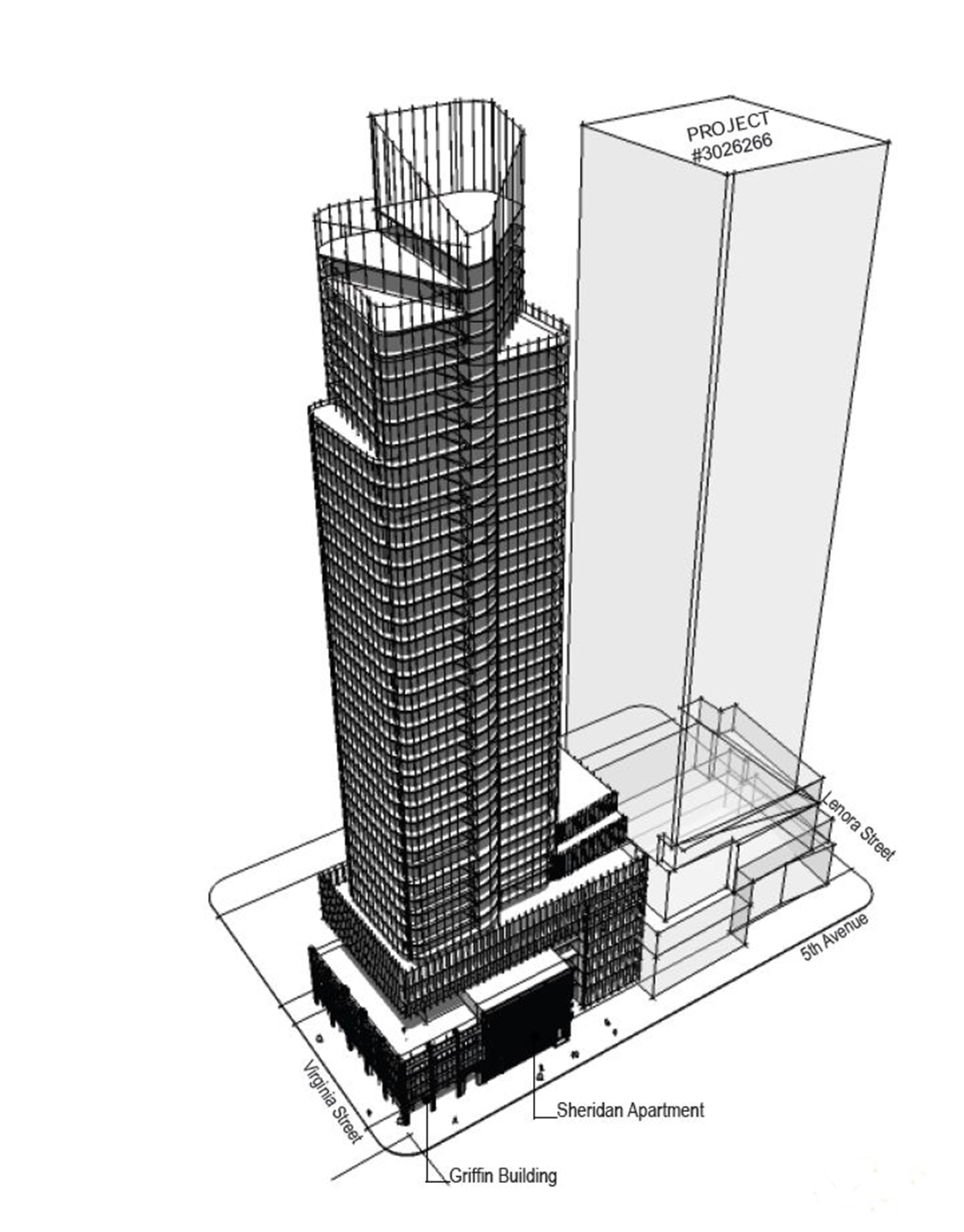 GWest's preferred design, which it calls “Belltown Gateway,” has a pedestrian arcade at the ground-floor level of the Griffin on the corner, with a 12-foot-wide, L-shaped public walkway. That 3,200-square-foot space would be recessed within the facade of the landmarked structure.