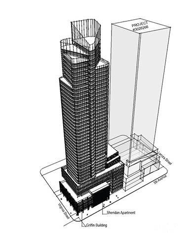In July, the two buildings on the corner were landmarked by the city's Landmarks Preservation Board, so the developer must preserve the facades of the Sheridan Apartments and Griffin Building, which date to 1915 and 1927, respectively.