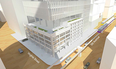 Above the podium, the Chainqui and Vulcan towers would be separated by 60 feet instead of 80. This would require design review board approval, as would the arcade along Fifth and Virginia.