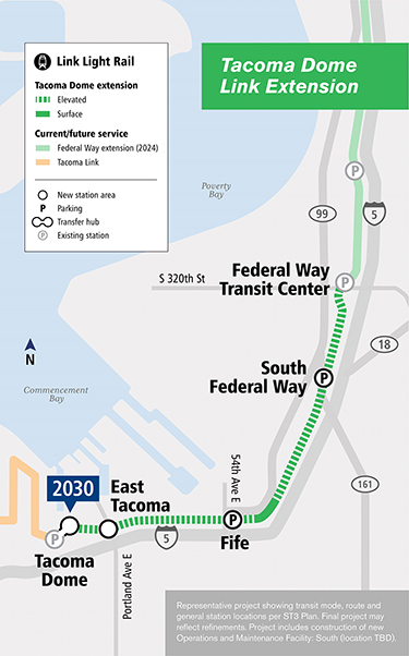 Planning is underway for a second major transit project to come to Tacoma, connecting the city to the expanding regional light rail system. The 9.7-mile Tacoma Dome Link Extension Project will bring light rail from Federal Way, with new stations at the Tacoma Dome, East Tacoma, Fife and South Federal Way.