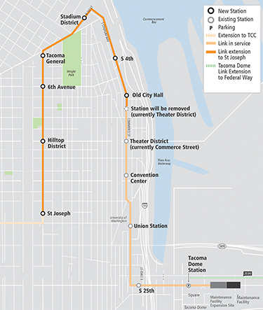 This 2.4-mile extension of the Tacoma Link light rail line will travel north along Commerce Street, then run along Stadium Way and Martin Luther King Jr. Way to the Hilltop District, with six new stations along the way. The new route will connect six medical facilities in downtown Tacoma along the “Medical Mile.”