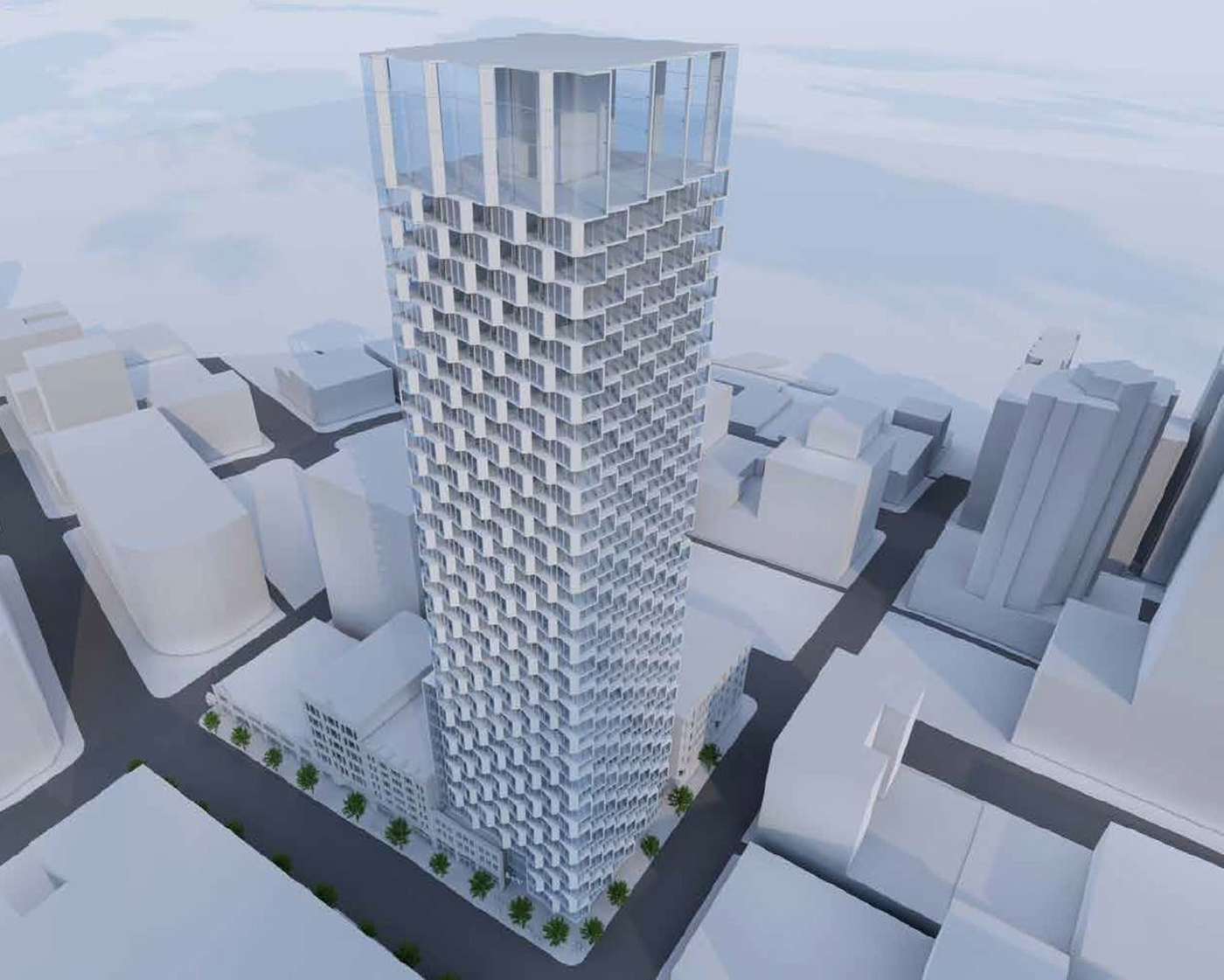 The 384-foot tower would have offices, apartments and 850 square feet of ground-floor retail on the corner. Four levels of underground parking for 104 vehicles would be accessed from the alley to the west.