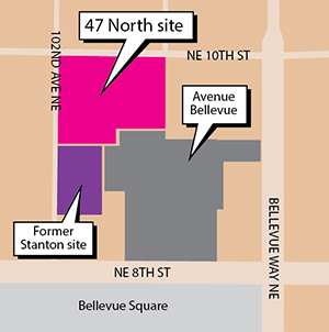 Avenue Bellevue (formerly The Elan) is proposed for the Cost Plus World Market site. Andy Lakha's Fortress Holdings LLC has spent $44 million to assemble about 2.7 acres on the south side of the block, at 10300 N.E. Eighth St. The recently updated plan, by Weber Thompson and CollinsWoerman, is for two high rises with 251 hotel rooms, 330 condominiums, retail and about 800 underground stalls.