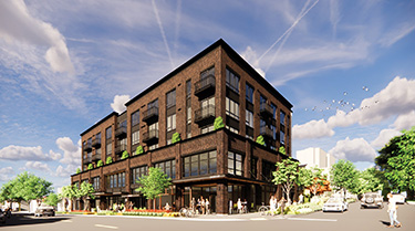Hunters Capital’s earlier plan for the 68-unit building harked back to the old Pike-Pine Auto Row. This updated version has more brick and an open corner at East Mercer Street for possible outdoor bar seating.