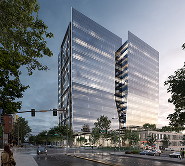 The building features dramatic X-shaped exterior steel bracing on its west and east sides — which might be termed an exoskeleton. Even so, the building would still have a conventional core, pushed west, but with very few interior columns. Floors would be most open to the east — overlooking the freeway and Cascades.