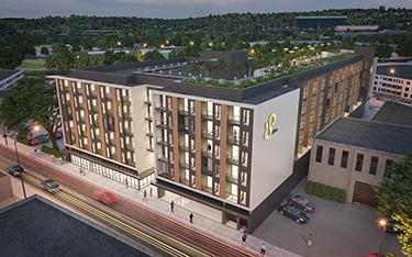 DLR Group was the architect, and Venture General Contracting was the general contractor. The project also includes one level of underground parking with 68 stalls. Bike rooms have 138 stalls. There's also a roof deck. Units run from studios to two-bedrooms.