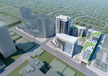 This preliminary rendering, looking southwest, shows how the two blocks might be developed.