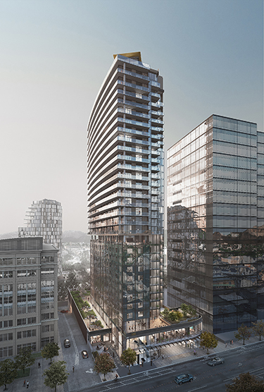 The 33-story tower, designed by VIA Architecture, has passed through design review. It'll replace a two-story office building from 1979, now or recently home to First Strike Games and the brokerage Compass. VIA lists the height at 345 feet.
