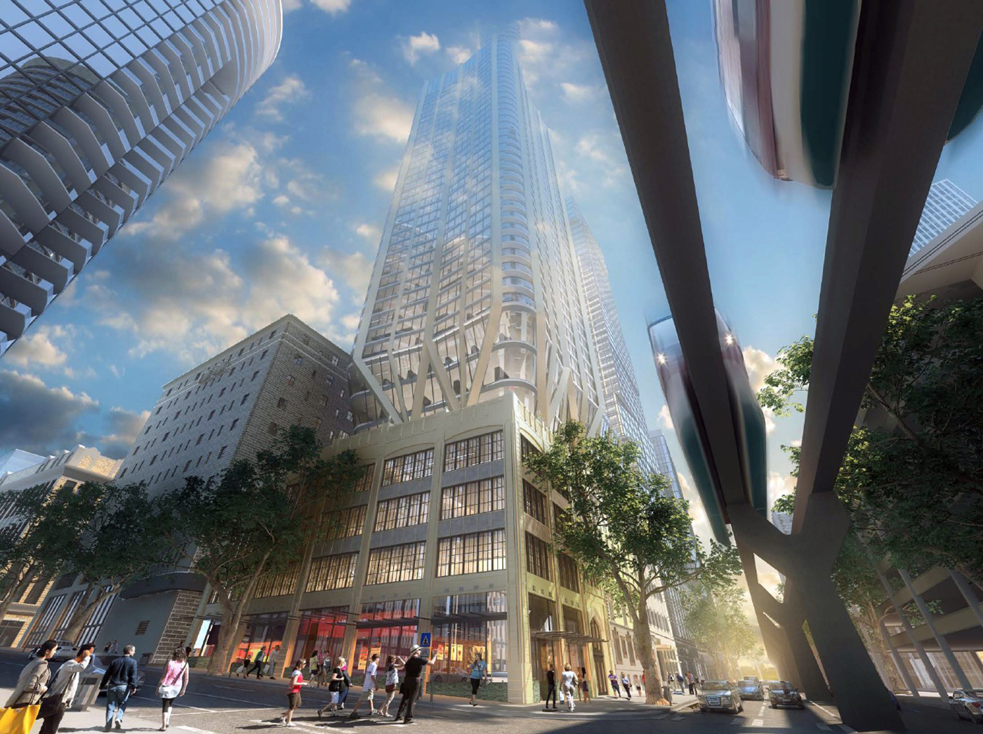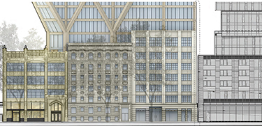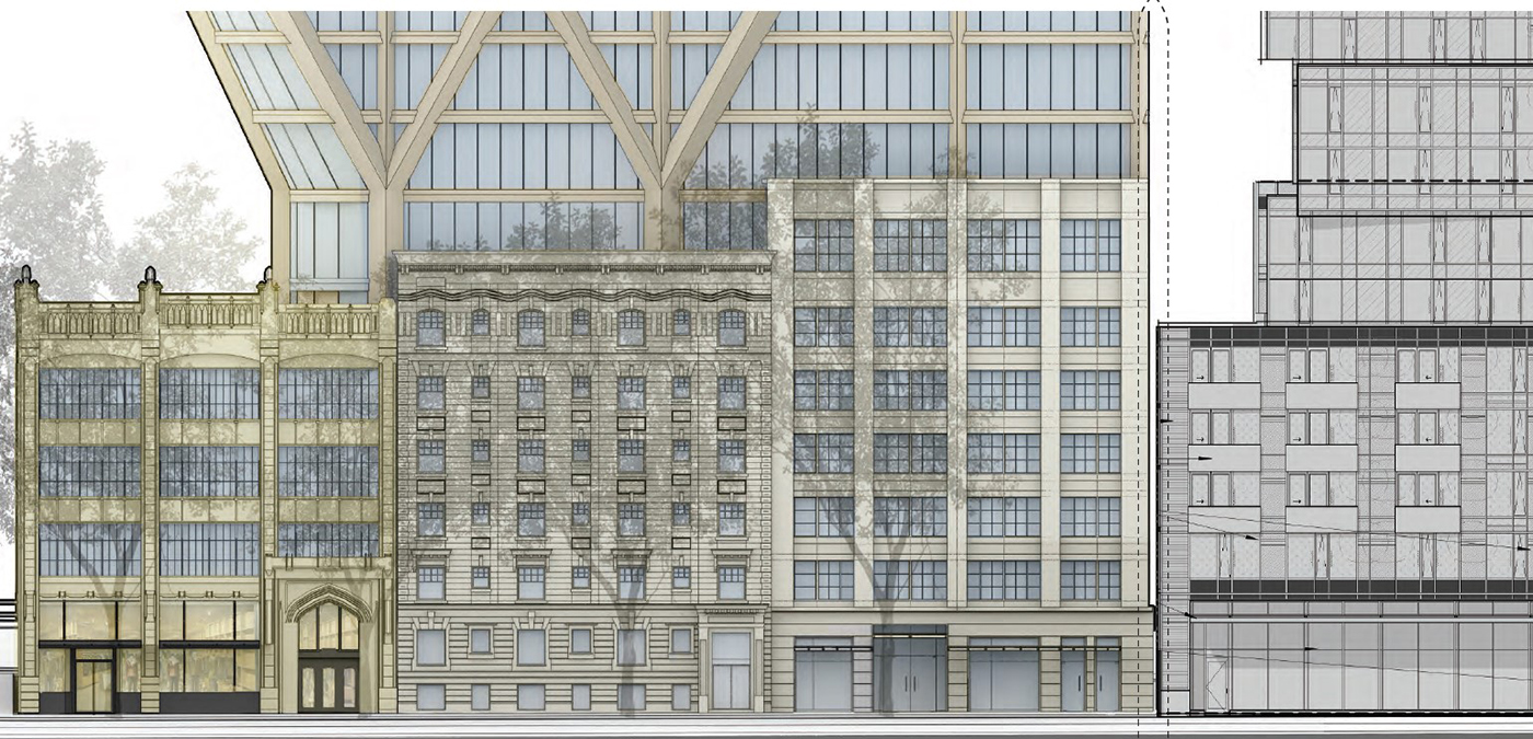 The main tower would begin with a dramatic Y-stem taper above its two landmarked buildings below.