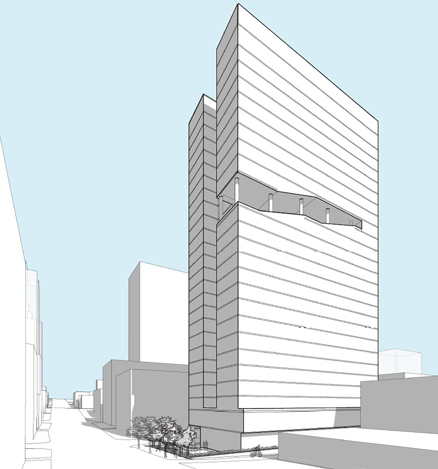 In Hewitt's preferred design, the east and west facades would feature prominent inset terraces at different levels of the building. Hewitt calls them social greenways. They read like carve-out diagonal notches. These open, exposed seating areas and stairs would each connect three different levels of the building revealed within. The east notch would connect floors seven through nine; and the west notch would connect floors 16 through 18.