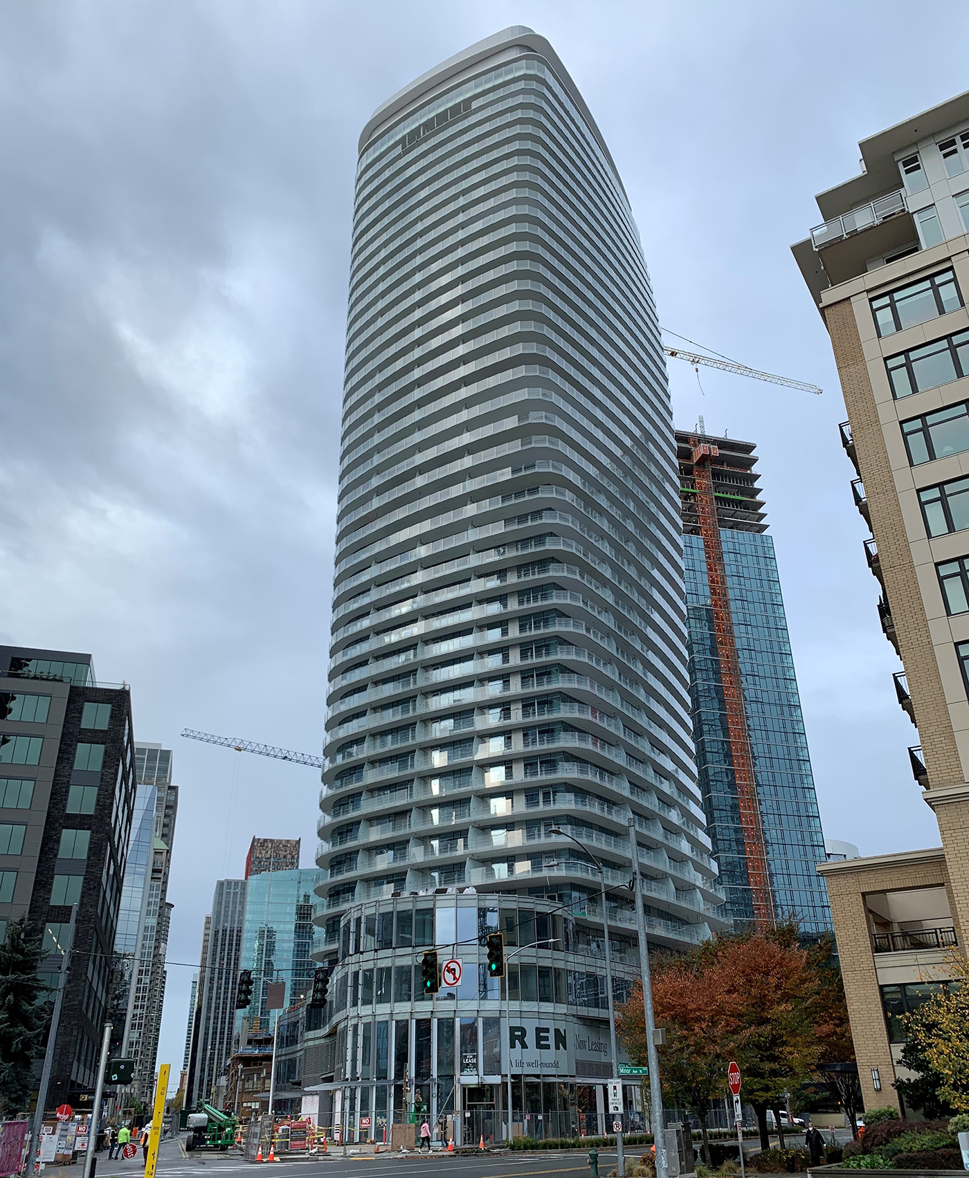 With its roots before the Great Recession, a Denny Triangle high-rise project has topped out, removed its crane and is putting final touches on the lower retail at 2014 Fairview Ave. Those bays are due to open in February, per leasing agent Gibraltar. And Greystar is now pre-leasing the 457 apartments at REN, which are to open early next year. No certificate of occupancy has been issued yet.