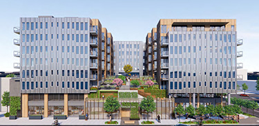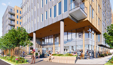 The public space includes what the developers call WiFi Plaza, facing a likely cafe on the building’s southeast corner.