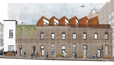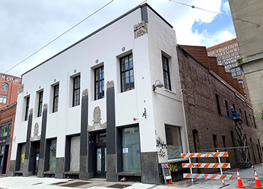 Contractors have sawed new entries into 115 Jackson from its west alley; that and the block's improved transverse alley — a former railroad spur — will link all three buildings in the RailSpur project. SHED's revised plan for 115 Jackson puts the hotel entry on its south end — opposite the newly renovated 419 Jackson office building (aka the former F.X. McRory's building), which is awaiting more new tenants.