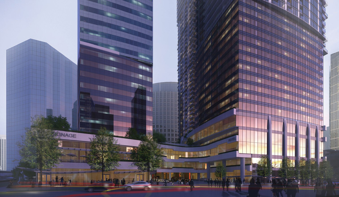 Onni’s current Bellevue program calls for two apartment towers and an office tower with a shared three-story podium. All three would rise to 600 feet. The north office building is slated to have 45 stories and 843,414 square feet. The east and west apartment towers would rise to 51 and 52 stories, with a combined 1,049 units. The west tower would also include a 257-room hotel on floors six through 16. No brand is indicated as of now.