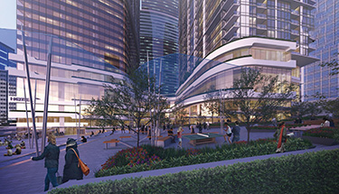 A 17,000-square-foot public plaza is planned for the southwest corner of site, facing the Northeast Sixth Street pedestrian connector. A splash park and public art are indicated there, along with many places to sit.
