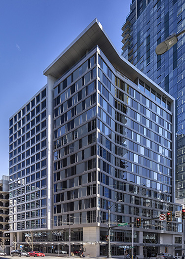 Completed in 2018 on the corner of Stewart Street, the 16-story hotel has 229 rooms. It operates as part of Hilton's Curio Collection. It also has a 3,300-square-foot restaurant, Patagon, and 5,000 square feet of top-floor amenity space — including the Fog Room lounge.