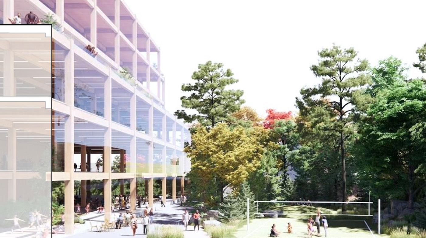 Google's architect writes, “It is the goal of Google to endeavor to use commercial mass timber construction on top of a podium,” with the latter made of concrete. The city says all five buildings will be mass timber. LEED Platinum certification will be sought. The goal for the campus is to be carbon-free by 2030, with only electric power for the campus. The city also says the development will address the “habitat gap” between the freeway and 120th, with its landscape architecture.
