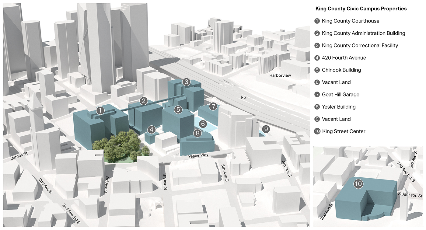 The county now has eight buildings on ten sites, some being full blocks. Its buildings total about 2.3 million square feet. The outlier is King Street Center, in Pioneer Square, which is too recent to raze. So, too, is the Chinook Building.