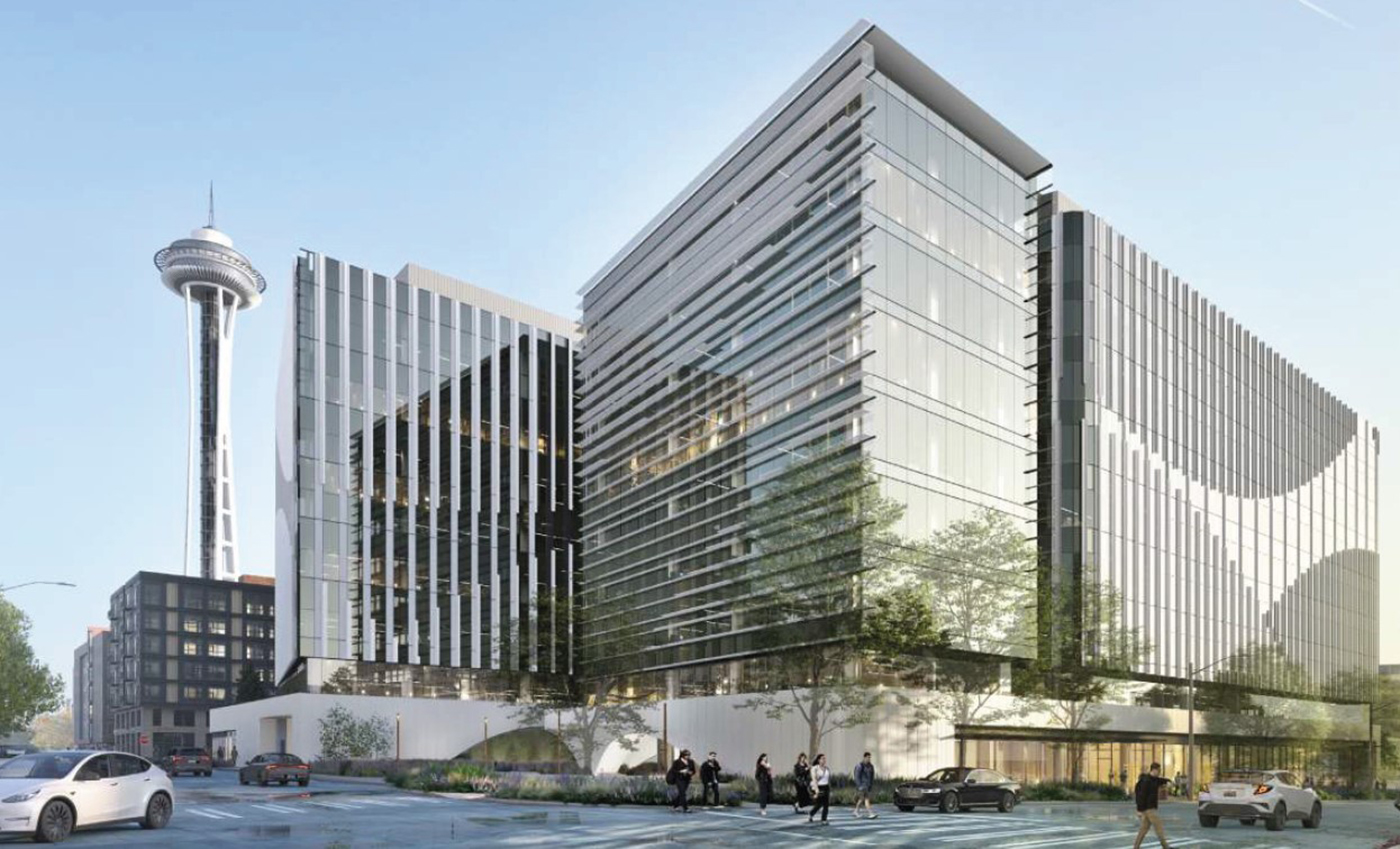 Two buildings are planned: east, facing Sixth Avenue North, and west, at 200 Taylor Ave. N. The block lies between Seattle Center and South Lake Union, and is also bounded by Thomas and John streets.