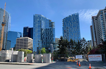The eight-story duo, designed by Encore Architects, will eventually rise on two sites: west, at 200 105th Ave. N.E. (the strip mall side of the alley; and east, at 201 106th Ave. N.E. (the Taco Time corner). They are to have 302 units in total.
