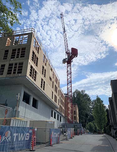 Venture General Contracting has finished the difficult foundation and concrete work, on a sloping Kirkland site at 12410 N.E. Totem Lake Way, and wood-frame levels are now rising rapidly above. A gantry crane is also swinging over the Grata at Totem Lake affordable housing project, where 125 units should open next year. TWG is the developer, and Third Place Design Cooperative the architect.