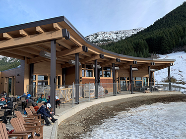 The big white yurt, a temporary structure at the base, remains for snacks and boot-tightening. The small Rafters restaurant remains atop the old west Cascade Lodge. (The ski shop has replaced the larger, lower old cafeteria.) The outdoor espresso stand is gone; look for your morning coffee up in the Rafters. And the outdoor Fireside area is newly offering breakfast fare.