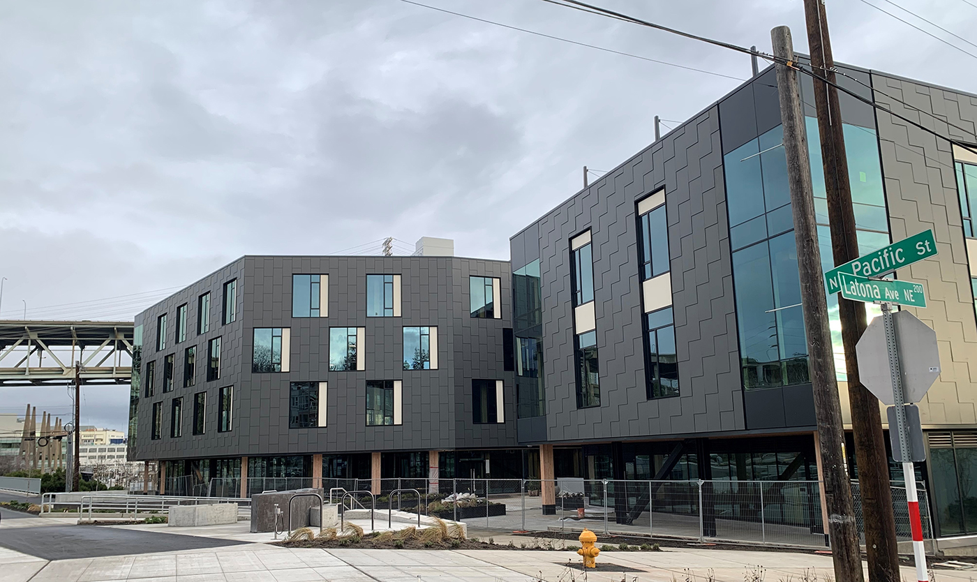 The handsome and mostly mass timber Northlake Commons building appears very close to its certificate of occupancy at 3800 Latona Ave. N.E., east of Dunn Lumber. Crews from Swinerton are now putting in the landscaping; Dunn signage will soon appear on the building's south side; and final polishes are being added inside. JLL is representing the office and lab space, with about 158,000 square feet, while First Western Properties is brokering some 6,200 square feet of retail and restaurant space.