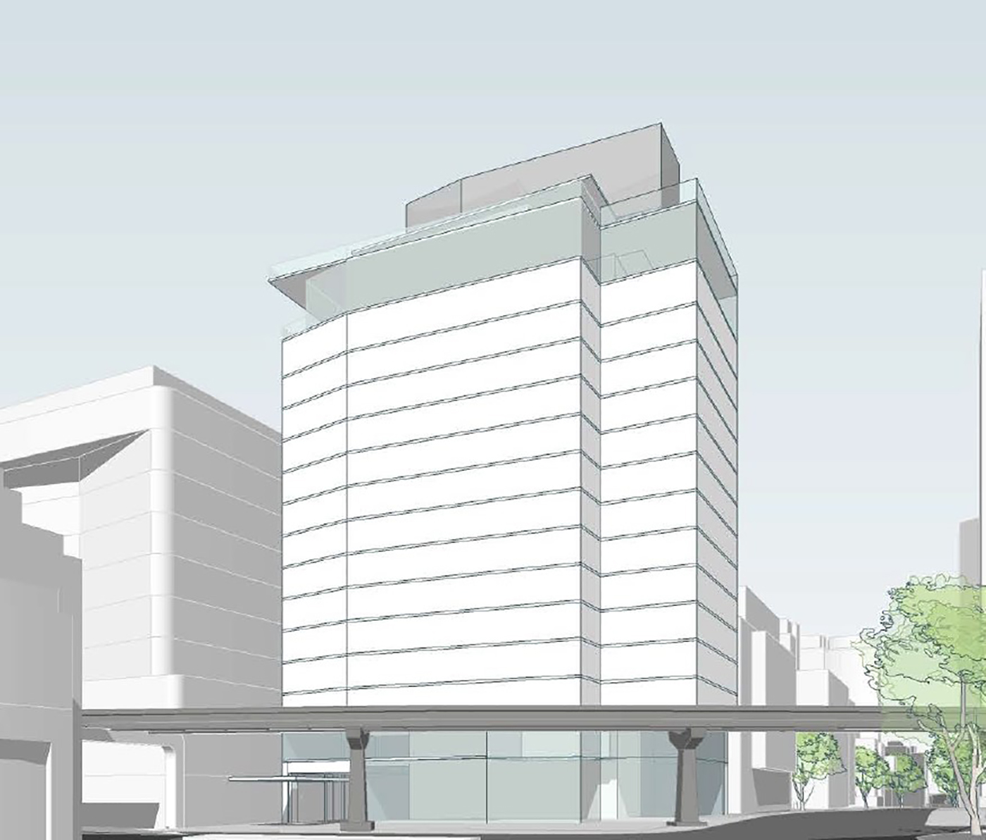 Unlike the Fat City building today, the monorail will run past a planned replacement hotel at 508 Denny Way, and not over that new structure. Da Li Development and architect Weber Thompson are proposing a 15-story, 170-room building, which will have its first design review on Feb. 28.