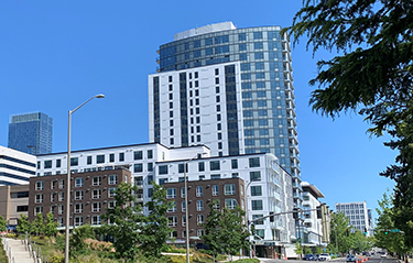 Alliance Residential has begun leasing two shiny-new projects next to East Main Station in downtown Bellevue. Addresses and names have changed since construction began in 2021, with Alliance as the builder and Encore Architects the designer.