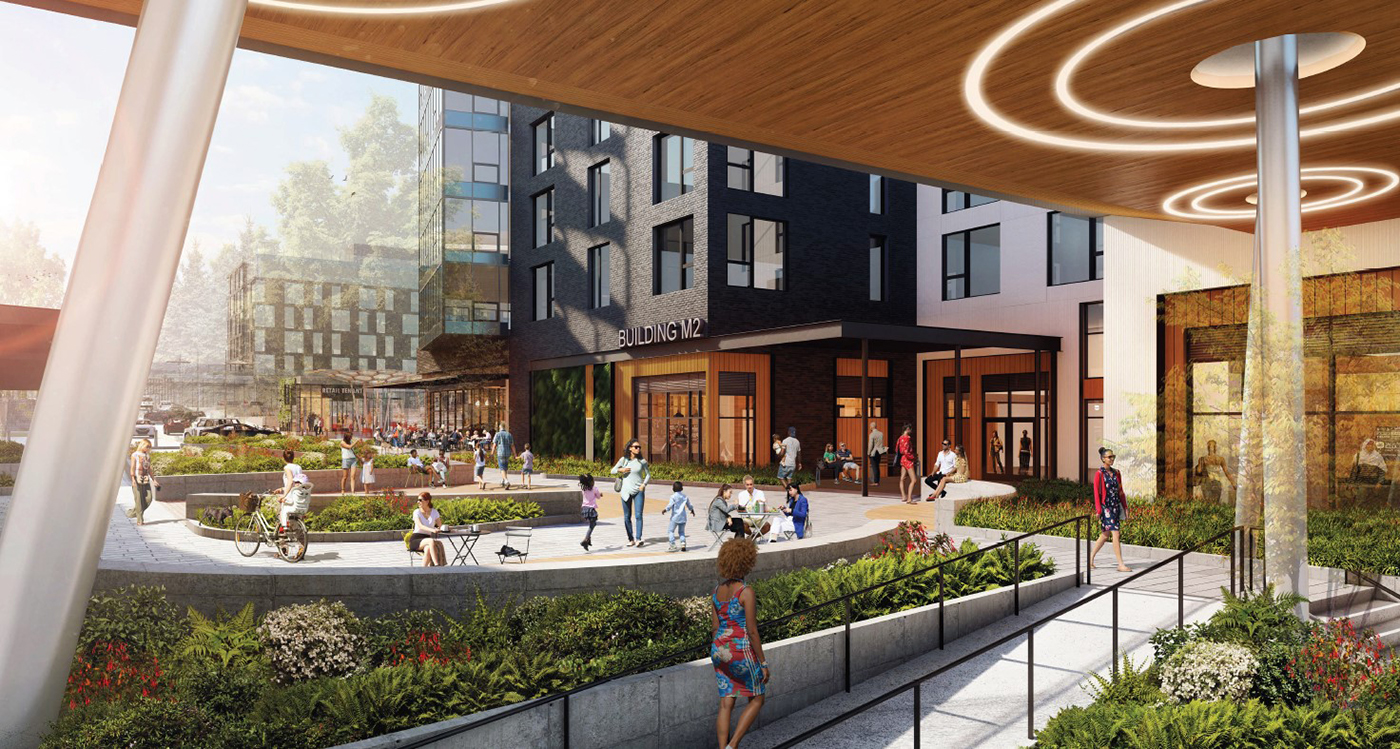 The midrise project will rise east of the Kraken Community Iceplex and Central Park. The larger north M2 building is to have 234 units, and will wrap around structured parking with about 569 stalls. That building now has busy city permit activity.