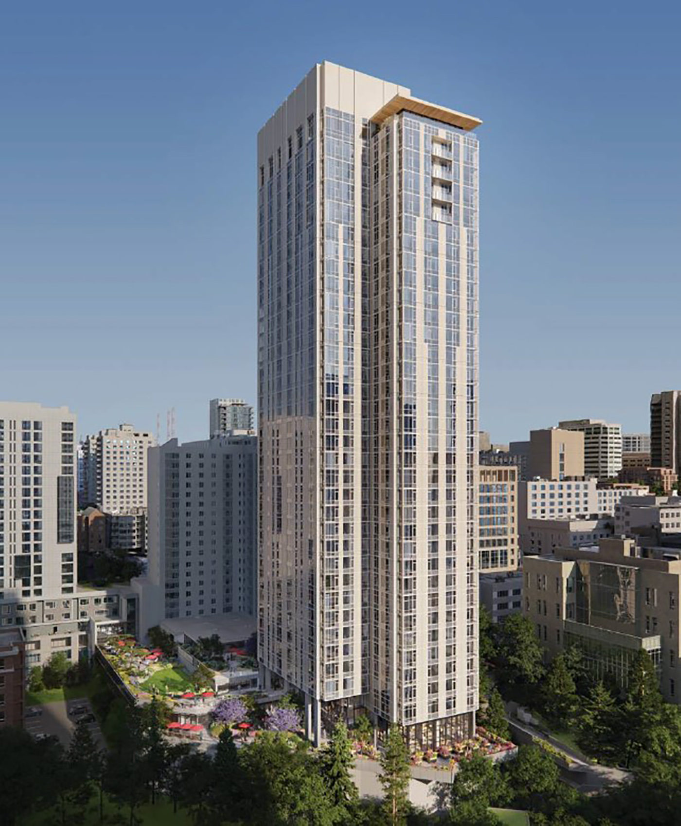 A lighter shade of facade cladding is intended to complement One and Two Union Square, “bringing soft brightness to a climate that is so often overcast and gray” and not being a dark, gloomy neighbor to the park. Landscaping all around the terraced gray podium is also intended to harmonize with the mature trees at the park below.