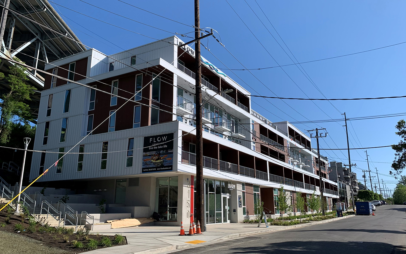 Flow can be a little hard to find. The five-story, 103-unit apartment building, which just received its temporary certificate of occupancy, is hidden down the slope toward Lake Union, at 3150 Fairview Ave. E. From Eastlake Avenue East, in the shadow of the I-5 Ship Canal Bridge, you can just see the top of the new apartments.