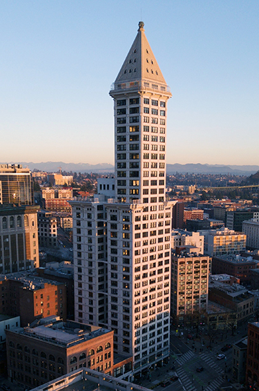 The city rates the tower at 37 stories. It's traditionally said to be 42 stories in height. It was completed in 1914 as the tallest structure west of the Mississippi, at 462 feet. The architect was Syracuse, New York firm Gaggin & Gaggin, for developer the Smith family — which made its fortune in typewriters. The family, also based in Syracuse, bought the land from Seattle's own J.W. Clise, still an important name in local real estate.