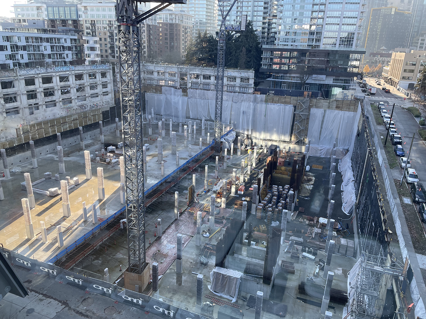 As the DJC first reported in October, Onni Group's large stalled office project at 1120 John St. — the north of two former Seattle Times blocks — is being rethought. (The south block apartments and hotel, on Denny Way, are done.) The parking garage pit for the north block is substantially done; excavation began in 2022. Two tower cranes remain in place.