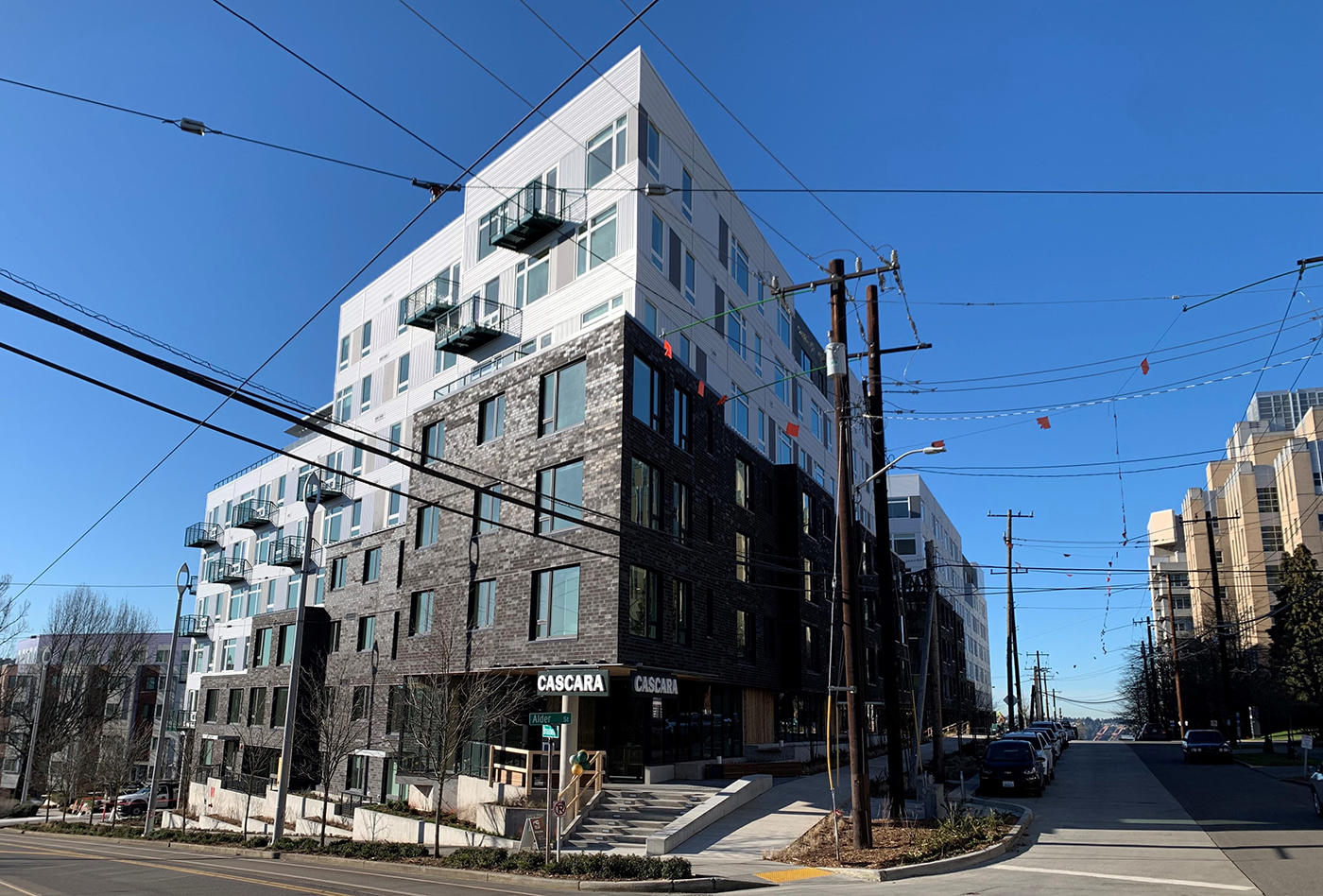 Leasing has begun at the new Cascara apartments, from Vulcan Real Estate. The city issued a temporary certificate of occupancy this week for the two-building complex at 225 Broadway, on the north end of the Yesler Terrace campus.
