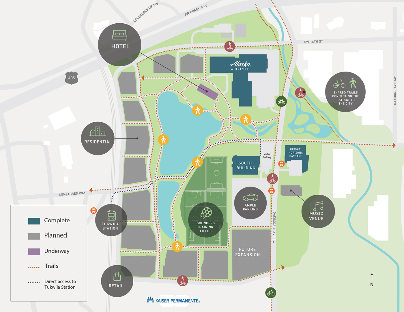The west side of the campus, bounded by the railroad tracks, is quite walkable to Tukwila Station, with its Sounder service, and RapidRide F Line stop.
