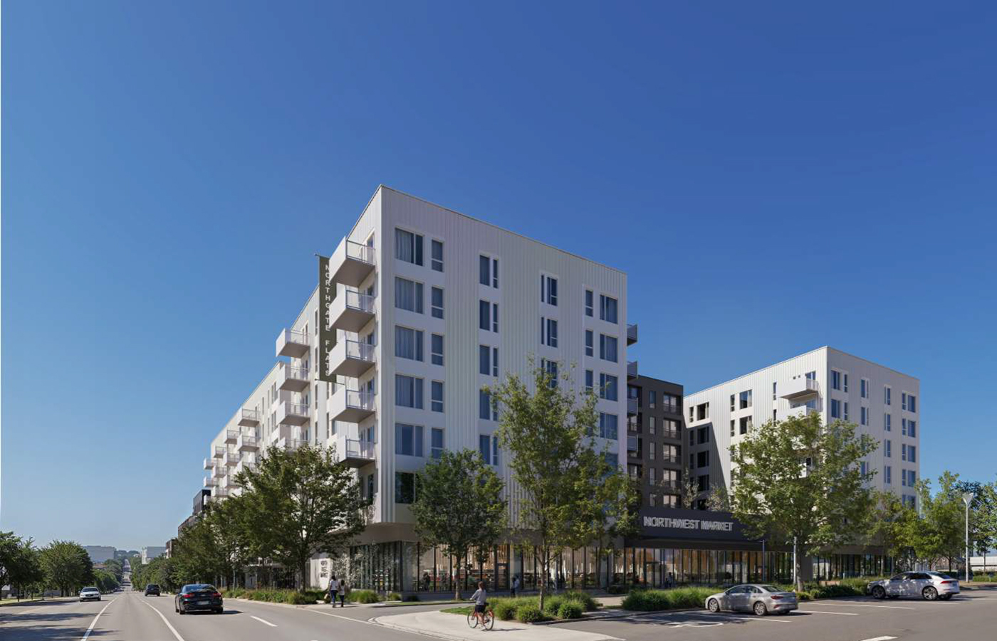 So the M1 apartments, still lacking an address on Fifth, are probably best aligned with current demand. Some renderings call the building Northgate Flats. As with the M2 and M3 buildings, the apartments will wrap around structured parking, here with 398 stalls. About 35,600 square feet of retail is planned.