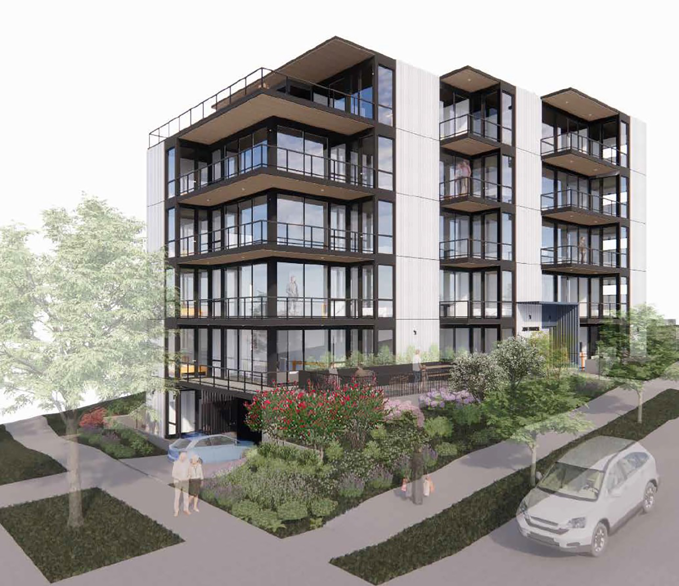 The compact apartment project could be done by year's end. Apartments are to run from one- to two-bedrooms, with sizes from 538 to 1,044 square feet. Terraces, small decks and patios are planned. Rooftop solar panels are also indicated.