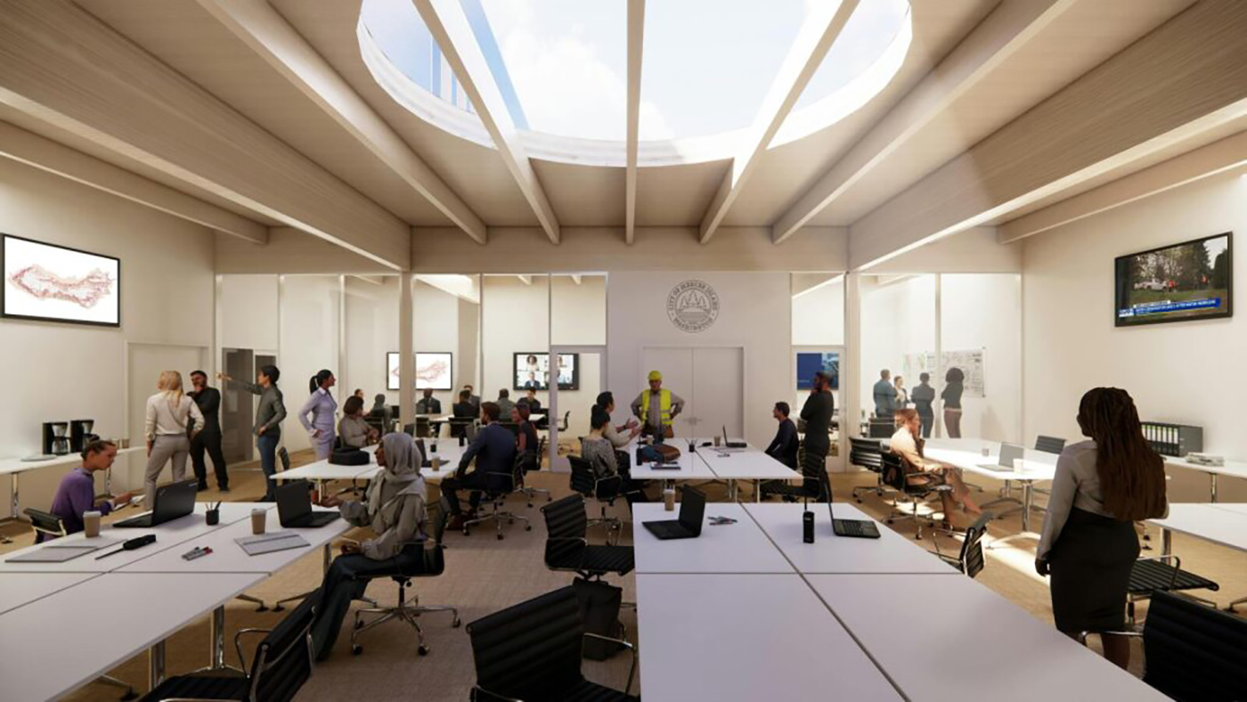 For the new two-story PSM structure, under a large shared roof, with covered parking between the two, there will be a larger north public safety wing and a smaller south maintenance wing. The north wing will house the Police Department, Emergency Operations, Public Works, IT and GIS Departments and Customer Service Center. (For staff and visitors, a newer, larger surface parking lot will front on 36th.)