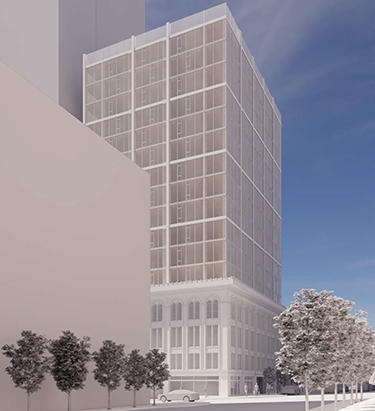 Seismic work is likely for the preserved masonry shell, which would have apartments on its upper three levels. Those units would continue with the mass-timber addition, reaching a height of 16 stories and a size of some 150,000 square feet. The hybrid building would rise to around 180 feet.