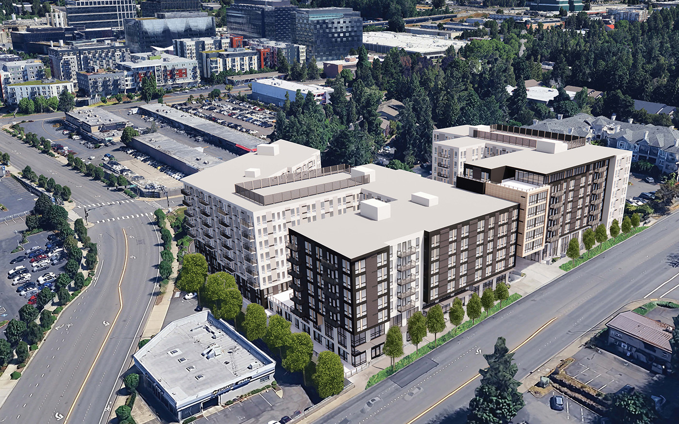 On Eighth, the very irregular 2.3-acre site is directly east of the Zadart exotic car dealership on the corner of 120th Avenue Northeast. (There are also Porsche and Mercedes-Benz dealers on the same strip.) Eighth begins climbing uphill at that junction, and the intended site has a real slope to it. Urbal's plan would present eight stories on lower Eighth, and more above.