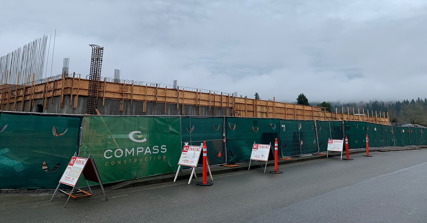 There was no announcement for the recent demolition of an old business park at 17311 135th Ave. N.E. in downtown Woodinville. That apparently came in September, based on the “No Parking” signs. Today, Phase VI of Woodin Creek Village is about one level above grade, as the DJC confirmed with a weekend visit.