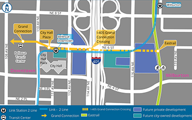 On west end of the GCX, at City Hall and Bellevue Downtown Station, an expansion of City Hall Plaza is still proposed. That would become the Forest Plaza room. (The city also owns a transit oriented development site there, where housing is planned.)