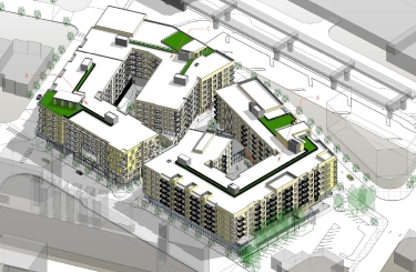 Plans filed with the city by Tiscareno Associates would divide the almost 3.5-acre Redmond Square site into east and west blocks, with a woonerf between them.